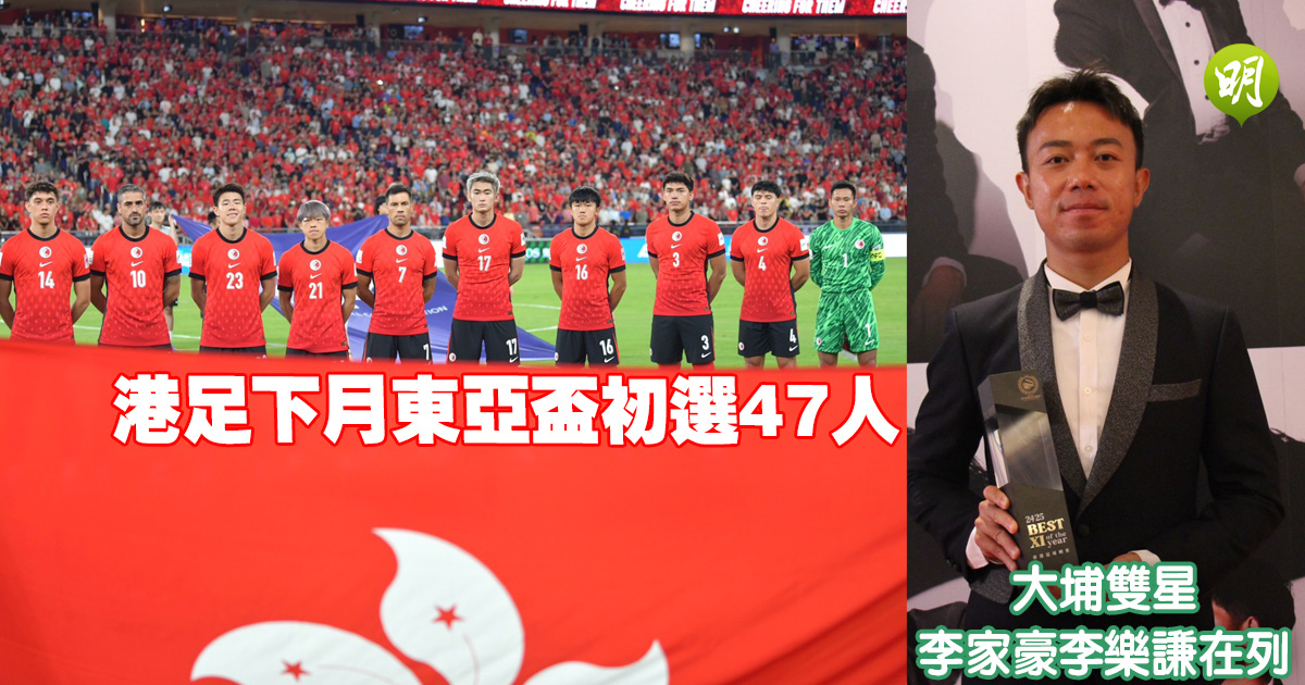 港足本月10日在啟德主場館出戰亞洲盃外圍賽,在42570名觀眾入場破紀錄下以1:0擊敗印度隊,緊接下月8至15日到韓國龍仁市出戰東亞盃決賽周,今午公布47人初選名單,除了有剛落實加盟中甲球隊延邊龍鼎的中堅勞烈斯,應屆港超冠軍大埔有5人入選,包括今年首度當選足球明星選舉11人的32歲右閘李家豪,則繼2019年底後再次列入初選,中場李樂謙與同為21歲的冠忠南區門將顏翱天則首獲徵召。上月底友賽曼聯後備入替的19歲後衛曾樂圖亦在列;而在傷在身的中場陳肇鈞、余在言、黃威和翼鋒艾華頓也在名單之中。