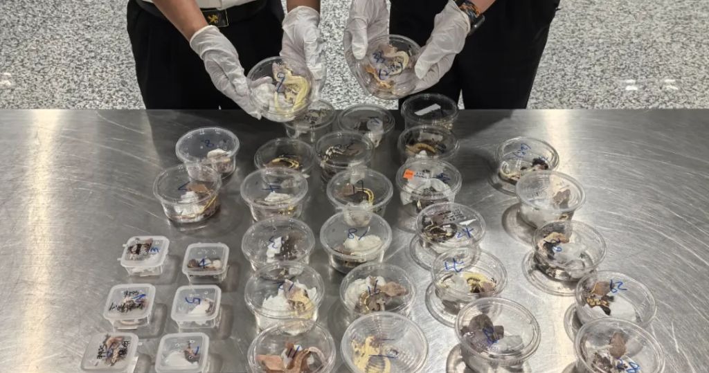 中國海關總署今日(19日)通報,杭州海關所屬杭州蕭山機場海關近日發現一名入境旅客的行李箱內疑似攜帶活體動物,開箱查驗,結果查獲活體「壁虎」35隻。經鑒定,該批活體動物全部為睫角守宮,在中國無自然分布,屬於外來物種,已依法移交後續處置部門。