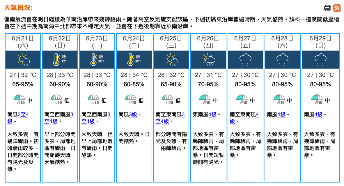即時熱點 天氣|天文台:周六多雲有驟雨 最高32°C (21:45) 發佈於 4 個月 前 2025 年 6 月 20 日 By 明報 天文台表示,本港明日(21日)預測大致多雲,有幾陣驟雨。初時驟雨較多。最低氣溫約27°C。日間部分時間有陽光及炎熱,最高氣溫約32°C。吹和緩偏南風。展望隨後兩三日大致天晴及酷熱。下周中後期驟雨逐漸增多。(天文台) 相關文章:天文台天氣天氣速遞編輯推介 Up Next 短片:上海LEGOLAND下月開幕 率先睇樂高過山車、積木船穿梭中式水鄉 (16:53) 不要錯過 將軍澳MCP變身迪士尼公主花園 短片搵公主坐南瓜車、飛氈打卡 (16:18) 繼續閱讀 贊助商 猜你喜歡 天文台上午8時40分錄18.4°C 今年入秋以來最低 (09:03) 天文台取消所有熱帶氣旋警告信號 (18:20) 天氣|天文台:周三有幾陣雨 市區最低19°C (20:57) 風神 | 緩慢趨向西南 海口3港停運 (00:34) 風神|教育局:幼稚園及部分特殊學校明日停課 (17:33) 天文台:下午5時20分直接發出三號強風信號 (12:06)