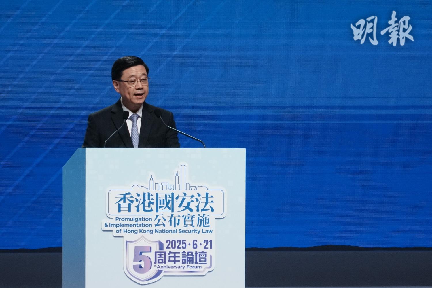 在「《港區國安法》公布實施5周年論壇」上,李家超致辭時提到,2019年「港版顏色革命」對本港造成巨大的創傷,是市民難以忘懷的慘痛記憶,形容當時「暴徒」肆虐、「港獨」猖獗、反中亂港份子「攬炒」本港,拉香港「跳崖」,令本港墮入痛苦深淵,安全蕩然無存。他指,感謝中央在港危急關頭公布實施《港區國安法》,止暴制亂立竿見影;而特區政府依法打擊危害國安的行為和活動,令社會回復秩序。