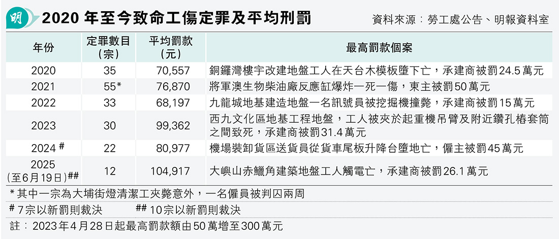【明報專訊】政府前年修訂《職業安全及健康條例》及相關法例,僱主一般責任條文的最高罰款額由50萬元增至300萬元,修例後發生之意外以新罰則審理。本報統計,2020年起以舊例裁決的170宗致命工傷定罪,平均每宗罰款約7.6萬元;以新例裁決的17宗定罪個案平均罰款約12.3萬元,增逾六成。工聯會立法會議員郭偉强認為罰款額仍低,「涉及性命,就算罰100萬都是不道德」,期望勞工處適時嚴謹考慮提出上訴。