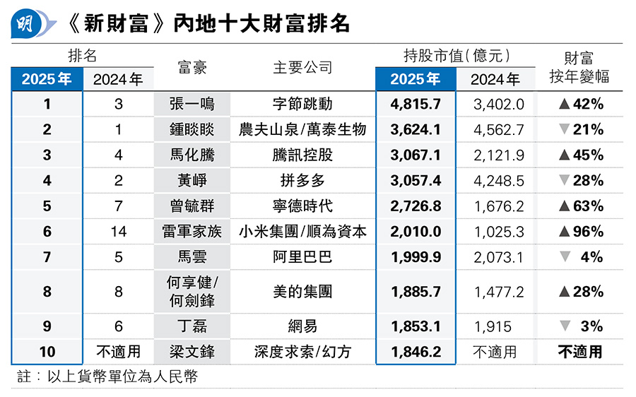 【明報專訊】內地《新財富》雜誌發布2025年「500創富榜」,當中字節跳動創始人張一鳴以4815.7億元(人民幣,下同)持股估值首次成為首富;去年他以3402億元排第三名。