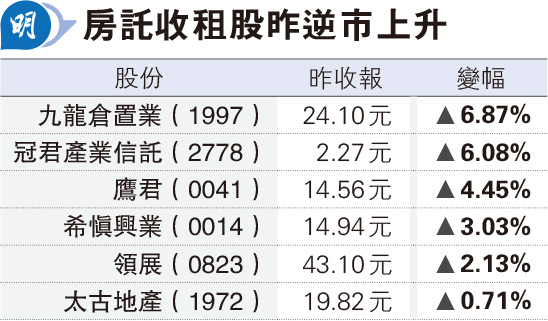 【明報專訊】本港5月零售終止連跌14個月,摩根大通認為香港零售走勢下半年或持續穩定,而作為非必需品零售市場指標的九倉置業(1997)有望短期內獲價值重估。該行大幅上調九置目標價六成至27.5元,並將投資評級「減持」調整至「增持」。九置昨股價逆市升近7%成最強藍籌,收報24.1元,成交2.5億元。其他零售收租及房託股亦普遍逆市上升。