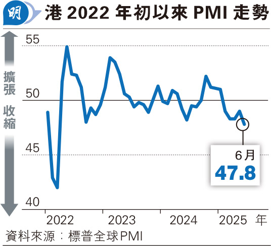 【明報專訊】標普全球6月香港採購經理指數(PMI)跌至47.8(見圖),較5月下跌1.2,顯示本港營商環境連續5個月轉差,而PMI倒退幅度則是2022年4月以來最大。此外整體商業信心則降至近5年最低,該行更根據新訂單指數等前瞻指標預計,下半年情况或更嚴峻。