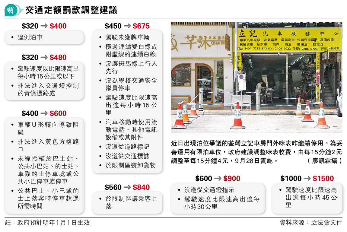【明報專訊】政府昨亦建議調整電動車牌費、咪表最高收費及交通違例事項定額罰款,當中俗稱「牛肉乾」的違例泊車罰款由320元加至400元;其他19項定額罰款劃一加價50%(見表),預計明年1月1日生效。運輸及物流局表示,違泊和大部分定額罰款已有31年未加價,部分交通罪行數字亦有上升或居高不下趨勢,認為加價有助提高阻嚇,同時會致力增加泊位。