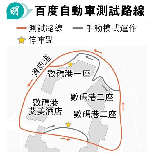 【明報專訊】去年底獲運輸署批出首個自動駕駛車輛(自動車)先導牌照的百度,今年3月獲數碼港支持,擬在數碼港園區1、2及3期安排兩台自動車在資訊道及數碼港道等指定路線測試。百度稱,測試期間車上會有一名最少10年以上駕駛經驗、並完成其提供不少於100小時的全職駕駛培訓的後備操作員,全程監控行車及路面情况,必要時接管車輛以確保安全。隨着在區內測試獲更多驗證,百度及後將逐步申請增加在數碼港路段的測試車輛數目。