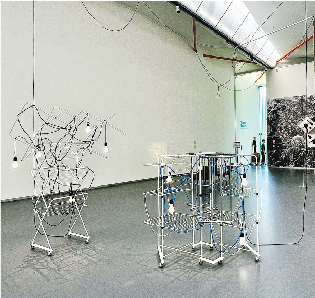 「家」像經常徘徊在她創作的靈魂,而「家品」就是肉身。一步入展覽,幾個晾衫架疊置起來。藝術家把平平無奇的家品轉化為雕塑。家品除了本來的形態和功能,還藏着文化和政治脈絡。例如,不是每個地方都流行這種晾衫架,即使它象徵了工廠生產一式一樣的塑膠製品,卻勾起每個觀者在自己家中、成長環境的日常記憶。