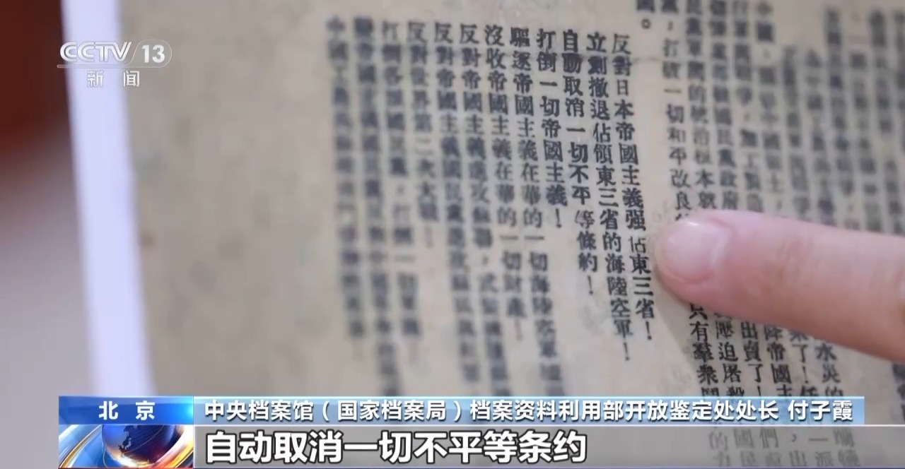 為紀念中國人民抗日戰爭暨世界反法西斯戰爭勝利80周年,今日(7日)起中央檔案館向社會集中開放第七批館藏檔案資料,共計5.7萬餘件,其中包括1931年「九一八事變」發生第三天,中共中央發表的《為日本帝國主義強暴佔領東三省事件宣言》。