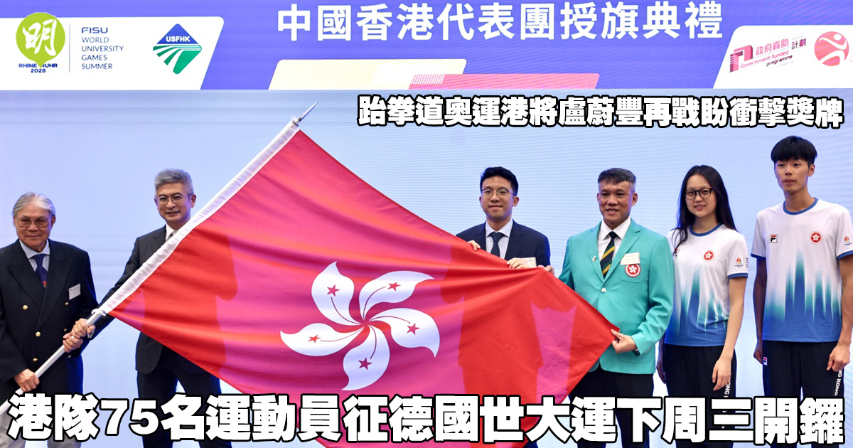 第32屆世界大學生夏季運動會將於下周三(16日)起至27日在德國萊茵魯爾都會區舉行,中國香港代表團將派出75名運動員出戰10個項目,下周一出征。中國香港大專體育協會今午(8日)於香港浸會大學郭鍾寶芬女士康體文娛中心舉行授旗禮。與港隊泳將張心悅同任今次授旗運動員代表的跆拳道運動員盧蔚豐認為,經過參與去夏巴黎奧運後提升信心不少,直言第二度出戰世大運目標是衝擊獎牌。