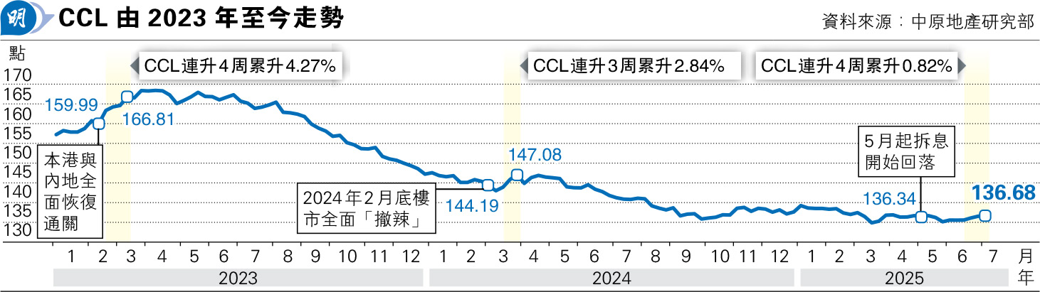 【明報專訊】樓價有進一步回穩迹象,具體反映6月16至22日市况的中原城市領先指數CCL,最新報136.68點,雖然按周僅升0.09%,但已經連升4周累升0.82%,是繼2023年2月中旬至3月中旬、CCL錄得4周連升後(當時連升4周累升4.27%),約28個月、即逾兩年以來首見(見圖)。