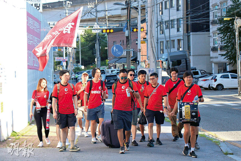 【明報專訊】專程前往韓國龍仁市捧場的港足球迷數量有增無減。球迷組織「香港力量」昨在對韓國隊賽前聚集球迷從附近輕軌站步行至比賽地點龍仁市龍體育場。資深球迷恆仔透露為這次東亞盃之旅「三來三回」,笑言即使奔波在港工作與在韓支持港足之間,仍稱「返嚟(韓國)係應該」。