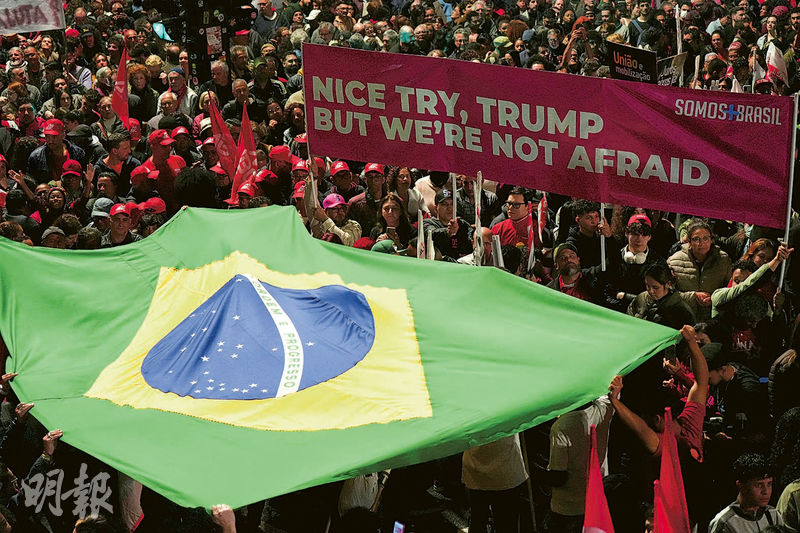 【明報專訊】巴西聖保羅市大批眾周四上街,抗議美國總統特朗普宣布對巴西「 對等關稅」大增至50%。示威民眾展示巨型巴西國旗,以及寫有「特朗普,不錯的嘗試,但我們不怕」字句的標語。