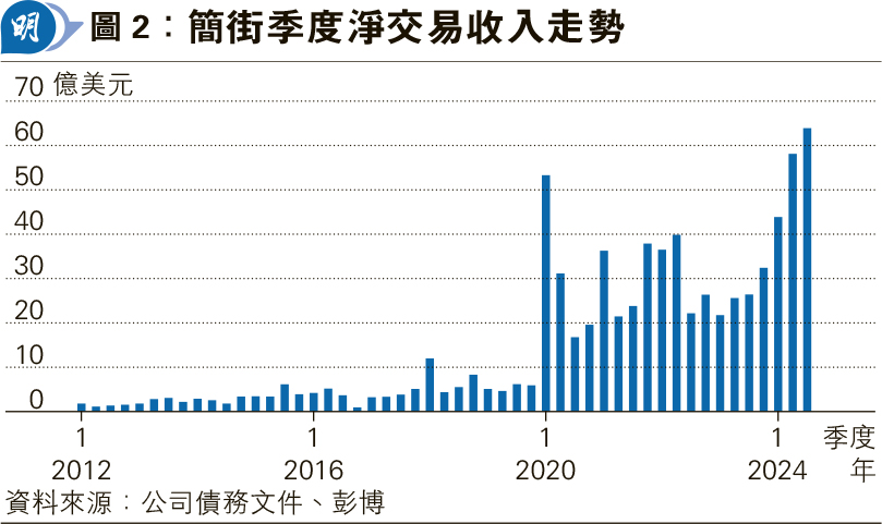 過往簡街季度淨交易收入大多低於10億美元,直到2020年首季錄得逾50億美元,其後偶有佳績,去年第三季再創高峰,淨交易收入高達逾60億美元(見圖2)。