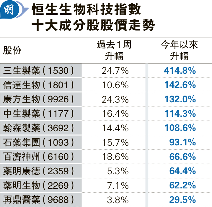 其餘生物科技股表現均遠較大市理想,信達生物(1801)漲1.4倍,翰森製藥(3692)及中國生物製藥(1177)均升1倍。百濟神州(6160)及石藥集團(1093)各升六成及八成。指數十大成分股中最弱的再鼎醫藥(9688),今年以來升約三成,但仍跑贏恒指。