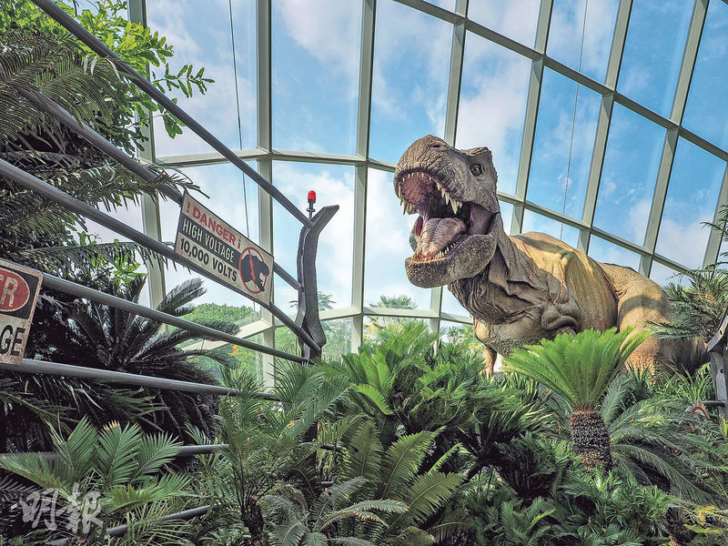 【明報專訊】今個暑假,除了戲院上映的強檔大片《侏羅紀世界:重生》,新加坡更將電影場景搬進真實世界!這場沉浸式侏羅紀展覽Jurassic World:The Experience,現正於濱海灣花園 (Gardens by the Bay)內的雲霧林(Cloud Forest)登場。一踏入這座巨型溫室便恍如穿越時空隧道,瞬間置身恐龍橫行的「努布拉島」,讓人走進電影世界。