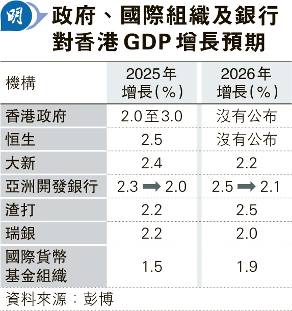 【明報專訊】亞洲開發銀行公布最新《亞洲發展展望報告》,預測今年香港GDP增長2%,較上次4月發布的報告下調0.3個百分點,為港府預測2%至3%增長區間的下限,明年增長預測亦由2.5%降至2.1%。亞開行指出,下調預測是反映美國上調關稅,環球貿易在未來數季走弱,影響香港出口和與貿易相關的金融活動。