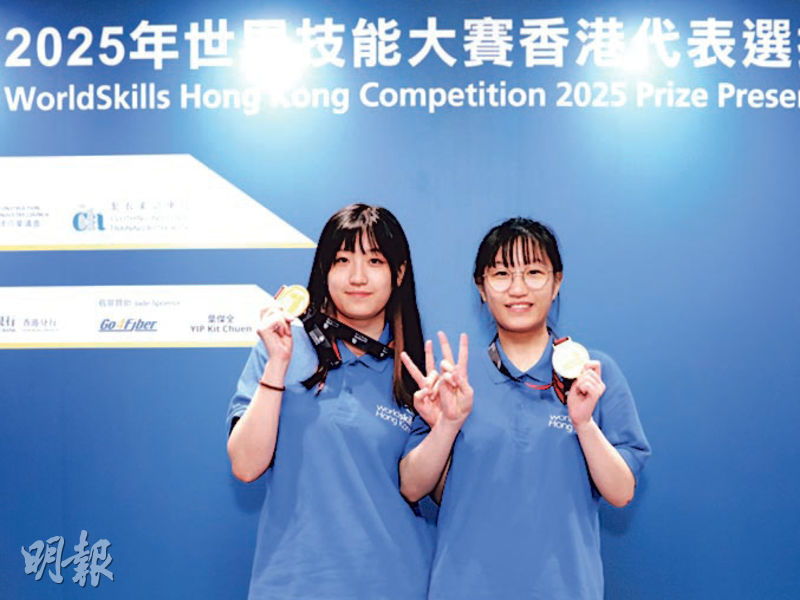 芸芸優勝者中有一對「孖女」,佢哋自小受媽媽薰陶,如今齊齊登上「平面設計科技」頒獎台。大孖黃詩薏平日鍾意畫圖學習生物科人體結構,細孖黃茜蔓就係動漫迷,鍾意神秘畫風,亦愛自創角色。比賽要求參賽者用電腦軟件設計海報、包裝等推廣產品,呢對「姊妹花」於是喺參賽期間善用AI,生成圖畫啟發創作靈感。佢哋話AI只係輔助工具,唔可以代替原創,畢業後都想成為平面設計師。
