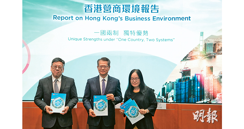 【明報專訊】政府昨相隔4年發布第二份《香港營商環境報告》,題為「一國兩制 獨特優勢」,引述多項利好的調查及數據,詮釋香港為「理想的營商福地」。財政司長陳茂波昨回應中美關稅戰對港影響稱,內地企業正將生產鏈遷至東南亞,打擊本港出口表現,認為香港需「轉型(adjusting position)」,聚焦發展高增值供應鏈管理及貿易融資等專業服務,隨着內地企業赴美上市日益困難,亦可乘勢邀請該些公司改在港上市。