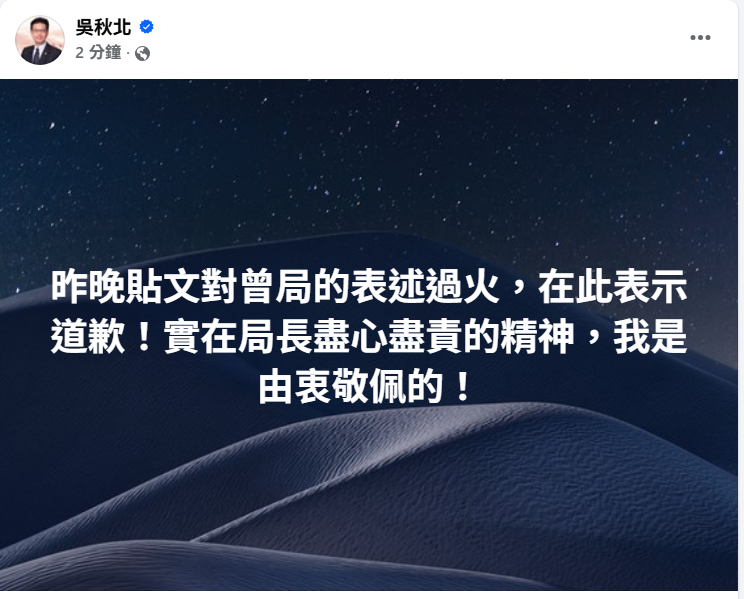 身兼行政會議成員的立法會議員吳秋北,昨晚深夜在Facebook指「曾局」就同性伴侶法案向他施壓,「威脅我必須保駕護航」。他今(1日)在社交媒體再出帖文,指昨晚帖文「對曾局的表述過火」,並就此致歉,又指「實在局長盡心盡責的精神,我是由衷敬佩的!」
