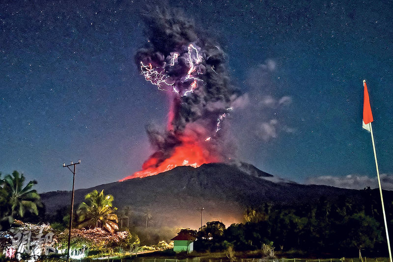 【明報專訊】位於印尼東努沙登加拉省的勒沃托比-拉基拉基火山(Mount Lewotobi Laki Laki)上周五(1日)晚上8月45分和昨日凌晨1時26分連續兩次大規模噴發(圖),火山灰柱高達1.8萬米,熾熱熔岩與閃電照亮夜空。印尼當局將火山警戒級別升至最高的第4級,並提醒民衆不得進入火山口半徑6公里及西南-東北方向7公里範圍內的危險區域。該省科莫多國際機場昨日部分航班取消或延誤。中國駐登巴薩總領事館呼籲中國公民密切關注印尼官方發布的預警信息,並關注峇里省、西努沙登加拉省和東努沙登加拉省機場航班動態。
