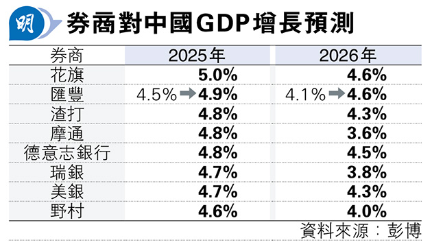 【明報專訊】匯豐將今年中國GDP增長預測由4.5%上調至4.9%,明年由4.1%上調至4.6%,主要因中美關稅戰對經濟的拖累低於預期,且官方更聚焦於結構性的改革以推動長期增長,預計供給側調整同時,需求端也有望獲得更多政策支撐。