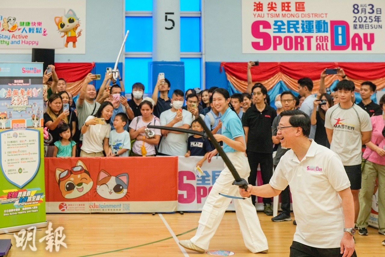 康文署今日(3日)舉行「全民運動日2025」,全港十八區指定體育館舉辦免費康體活動。活動主場館設於九龍公園體育館,特首李家超與文化體育及旅遊局長羅淑佩到場參與活動,其中李家超試玩虛擬劍擊,獲奧運金牌「劍后」江旻憓指導,成功擊中目標得分。