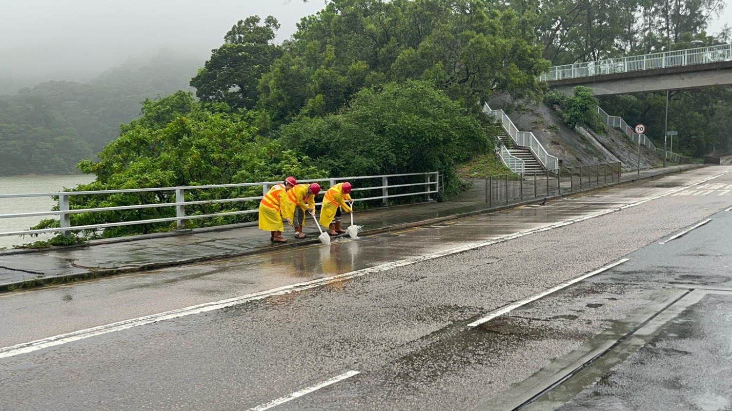 渠務署又指,緊急事故控制中心已即時啟動,並派遣90隊緊急應變隊伍處理市民求助個案,清理水浸情况,重覆巡查及清理全港約240個因淤塞而容易水浸地點。渠務署於社交平台專頁「下水水」上載圖片,顯示緊急應變隊伍於黃大仙龍翔道和柴灣道迴旋清渠。