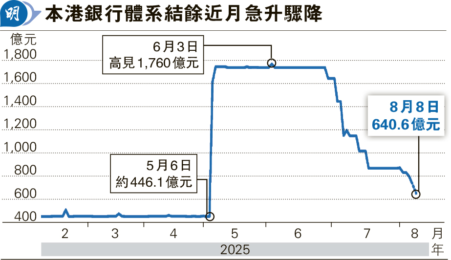 【明報專訊】港元於昨日香港交易時段觸及弱方兌換保證7.85,金管局再度接約84.39億元的港元沽盤,令銀行體系總結餘將於本周五(8日)下降至約641億元,計及是次操作,金管局自6月26日起已10次入市承接港元沽盤,銀行體系結餘累計減少1094.96億元。有分析認為,目前美元擔保隔夜融資利率(SOFR)及港元拆息(HIBOR)的息差仍大,沽港元、買美元的套息交易仍保持一定吸引力,而現時總結餘回落至接近5月初急升前水平,未來港元拆息理應將回升。