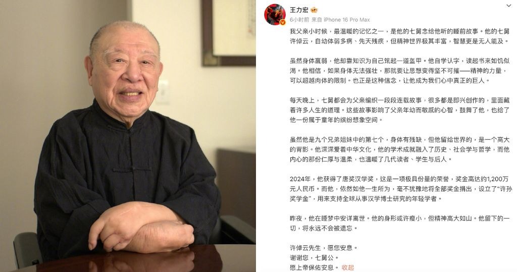 著名歷史學家許倬雲8月4日在美國去世,享年95歲。歌手王力宏今(5日)發文哀悼,指其七舅公自幼體弱多病、先天殘疾,但精神世界極其豐富,智慧更是無人能及。