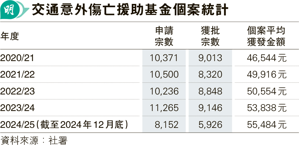 社署表示會密切監察新安排的推行情况,並繼續嚴格審核每宗交通意外傷亡援助申請,如懷疑任何個案涉及欺詐或其他刑事成分,會轉交警方調查。截至去年3月31日,交通意外傷亡援助基金的累積盈餘約14.54億元。