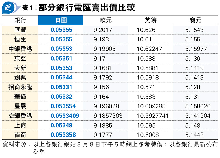 日圓匯價或趨升,若計劃於今年稍後時間遊日人士,或需考慮趁現階段日圓匯價仍處於相對較低水平,逐步兌換遊日旅費。至於在何處兌換,儘管找換店向來予人兌換率較銀行為吸引的印象,但其實於銀行以電匯價(TT Rate)兌換外幣的匯率,也有機會較於找換店兌換外幣現鈔的匯率為低。對於計劃一家大細出遊,又或出遊時間較長人士,旅費隨時可逾萬港元,即使分批兌換日圓金額亦不少,更應在兌換率上貨比三家。比較8月8日下午5時多間銀行的參考牌價,其中華僑銀行的每1日圓兌港元的電匯賣出價為0.05332,招商永隆更達0.05331(見表1),便較同日不少找換店的現鈔賣出匯價主要介乎約0.0535至0.0539為低。