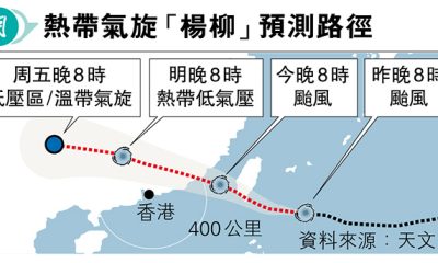 【明報專訊】位於西太平洋的強烈熱帶風暴「楊柳」持續向西移動,天文台預測楊柳今日增強為颱風,明日大致移向台灣一帶,並進入本港800公里範圍,橫過台灣,隨後靠近廣東東部至福建南部一帶,但登陸位置及強度仍有變數。天文台稱,根據「盤古」人工智能電腦模式預測,楊柳周四移入廣東內陸後,會以較目前預測更接近香港路徑移動,在本港以北掠過,若屆時楊柳仍維持較強強度,本港部分地區風力可能短暫達烈風程度。