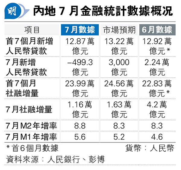 【明報專訊】人民銀行公布7月內地金融統計數據,7月新增人民幣貸款萎縮499.3億元(人民幣,下同),為2005年7月以來首次,顯示當月的還款金額多於借貸,差過市場預期增長3000億元。人行主管媒體《金融時報》隨即發表評論,表示近期企業融資渠道多元化、銀行減少虛增空轉貸款、中小企欠款獲結清降低其貸款需求,單月貸款數據不足以準確反映經濟活躍程度和金融支持經濟的力度,認為不宜過度炒作單月信貸增量讀數波動。