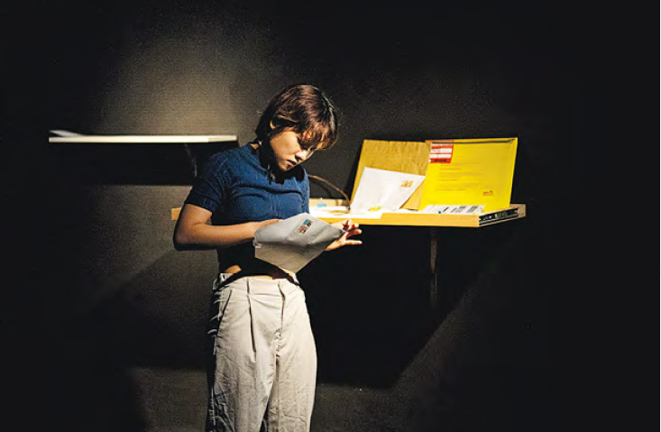 走入展場,卻不多見直接「貼題」回應上述情感經濟之作,更多是在情感遷移與孤獨的脈絡下作出隱伏的回應。如曾以交友應用程式為靈感創作的廖家明,這次的三頻道有聲錄像《陸上行舟》,則將在舊碼頭保持身體平衡的行為表演與水上人歌謠並置,探討城市發展和集體遷移下,族群記憶與身分情感如何流傳。吳暐君的裝置作品《Unpacking》展示一系列俄羅斯娃娃般的信封,一封包裹着另一封,全是收到後再次寄給自己的信件,當原本的信息隨着一次次的寄送反覆封存,作品以信件、郵票探問,縱然有傳遞的基建,情感的送達又是否必然。除卻最外層信封自她現時身處的巴塞隆拿寄回香港,其他都在她未獲批簽證到外地留學而「滯留香港」時寄出,記錄了另類的生活遷移軌迹,KY則指其背後指向更龐大的資本架構——當地郵差有否罷工、政府運作有否癱瘓,情感與現實種種架構交互梭織影響。