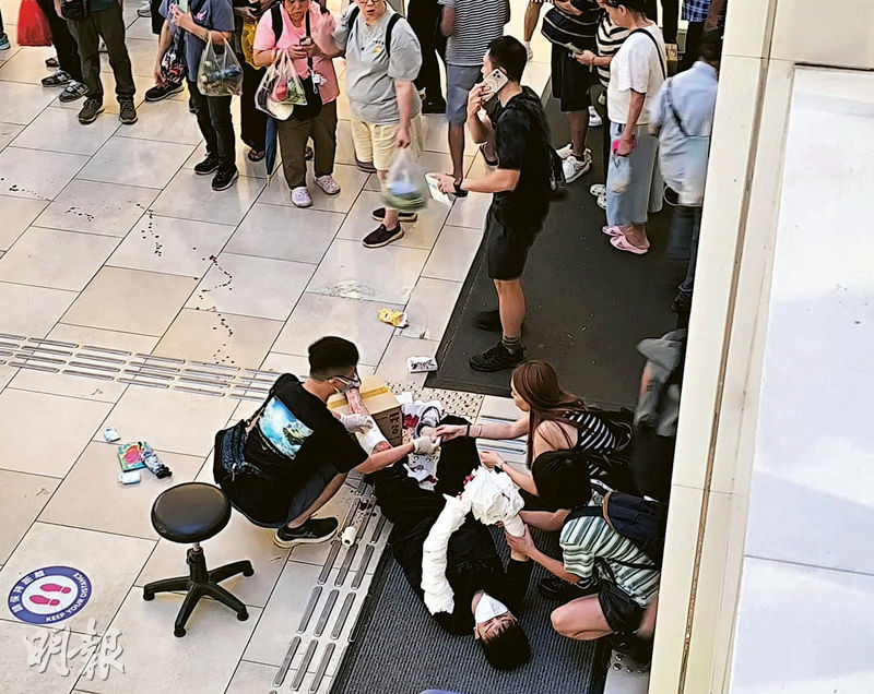 昨傍晚6時許,警方接獲報案稱良景商場入口位置發生持刀襲擊案,一名男子懷疑被一名非華裔男子斬傷,流血倒地。36歲姓梁男傷者手、腳、胸口共9處刀傷,傷口分別長約2至7厘米。施襲的非華裔男子傷人後逃去,警方調查後,昨晚拘捕一名懷疑涉案男子。網上圖片可見商場遺下一條血路,男傷者躺在地上,有市民為他止血包紥。警員到場調查,有持長盾戒備。