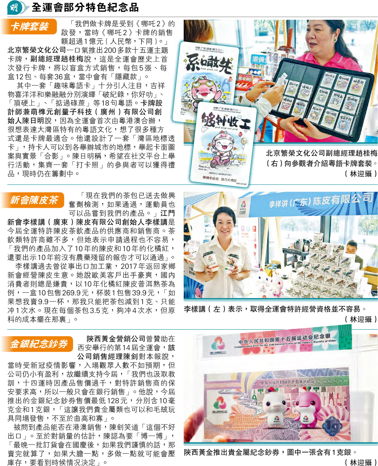 【明報專訊】想到吉祥物,只知道毛公仔?距離第15屆全運會開幕還有82天,廣東賽區執委會早前召開市場開發推介活動,展出逾千款全運及殘特奧運特許商品,當中涵蓋服裝、茶具、卡牌、拼圖等多個品種。有特許供應商表示,過去多次參與大型賽事活動,希望藉全運熱度獲得樂觀營收。