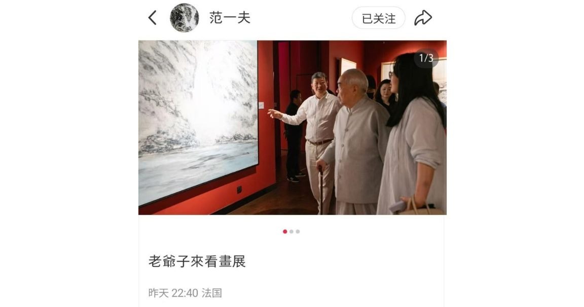 87歲知名畫家范曾近日傳出「失蹤」消息【相關報道】,范曾繼子北京時間8月16日晚,在小紅書帳號「范一夫」發布三張范曾看展照片,配文「老爺子來看畫展」,發文地點顯示為法國,疑為對近日有關范曾失聯傳聞的回應。