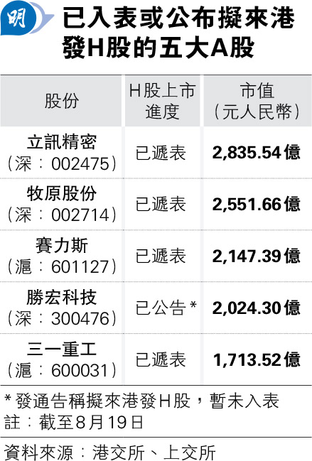 【明報專訊】A股精密智造解決方案公司、蘋果(美:AAPL)核心供應商之一立訊精密(深:002475)周一(18日)遞表申請來港上市,中信證券、高盛及中金(3908)為聯席保薦人。截至昨日收市,該股市值逾2835億元人民幣(約3080億港元),為目前已遞表及已公布來港上市計劃的A股公司中市值最大(見表)。