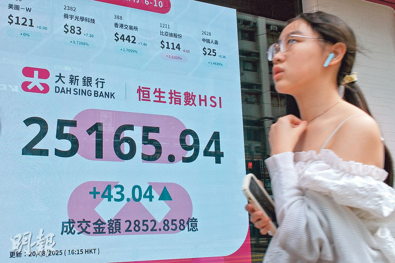 【明報專訊】美聯儲局主席鮑威爾發言前市場觀望氣氛濃厚,大市繼續缺乏方向,惟港股四連跌後見喘穩,昨早段曾隨亞股向下兼試穿二萬五關後見支持,午後乘A股發力再上,港股喘定略見回升,收市倒升43點,報25,165點。大市全日成交增至逾2852億元,資金追逐業績股,泡泡瑪特(9992)季績勝預期,加上管理層前瞻樂觀(見另文),全日逾百億超大成交急漲逾12%,另一新消費股老鋪黃金(6181)績優亦升9%,舜宇(2382)績後升近一成。