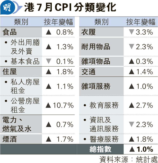 【明報專訊】政府統計處公布,本港7月整體消費物價指數(CPI)按年升幅放緩至1%,略高於市場預期的0.9%,但為2021年6月後最低升幅。政府解釋,7月的升幅較6月為低,主要因6月的差餉寬減上限較去年同期低,而去年及今年7月均沒有相關寬減。剔除所有政府單次紓困措施影響,基本通脹率按年升1%,與6月升幅相同。政府發言人表示,由於本地成本及外圍價格壓力仍大致可控,整體通脹短期內應維持輕微。