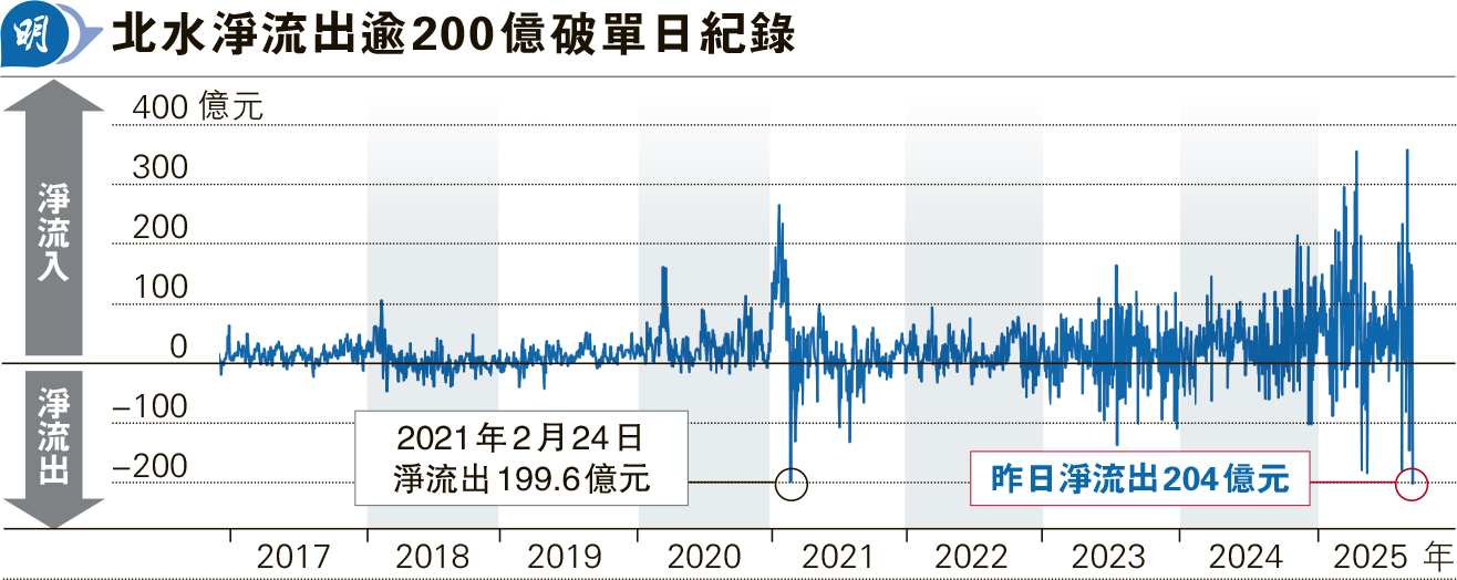【明報專訊】港股昨日期指結算日,在隔夜美股回升、A股續穩情况下,港股獨憔悴,早段愈跌愈急,一度大跌近400點。午後A股發力再上,港股跌幅收窄,收市仍跌逾200點,失守兩萬五關。大市成交再創逾4個月高,北水破紀錄淨流出達204億元(見圖)。
