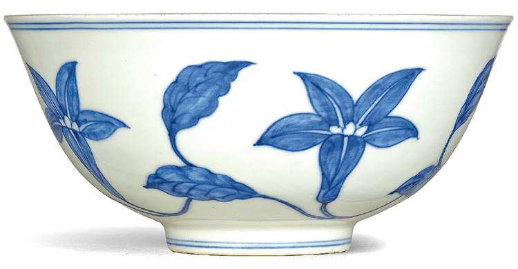 今次拍場中的一件「宮盌」是當中焦點。「宮盌」指成化御窰所製的青花盌器,是宮廷食具,特色是典雅含蓄。明成化青花梔子花宮盌「大明成化年製」款珍貴之處,在於成化窰製作青花宮盌的時期前後只有10年(約1480年代)。李佳解釋:「成化帝在位20多年,但宮盌卻是在位末10年的出品。明永樂、宣德時期的材料來自波斯,燒出來會有鐵斑,但明成化出品使用含鐵量低的『平等青』作材料,燒出來的顏色較美和淡雅。」成化以嫻雅秀麗、做工精細別樹一格見稱,但產量有限,曇花一現卻流芳百世。