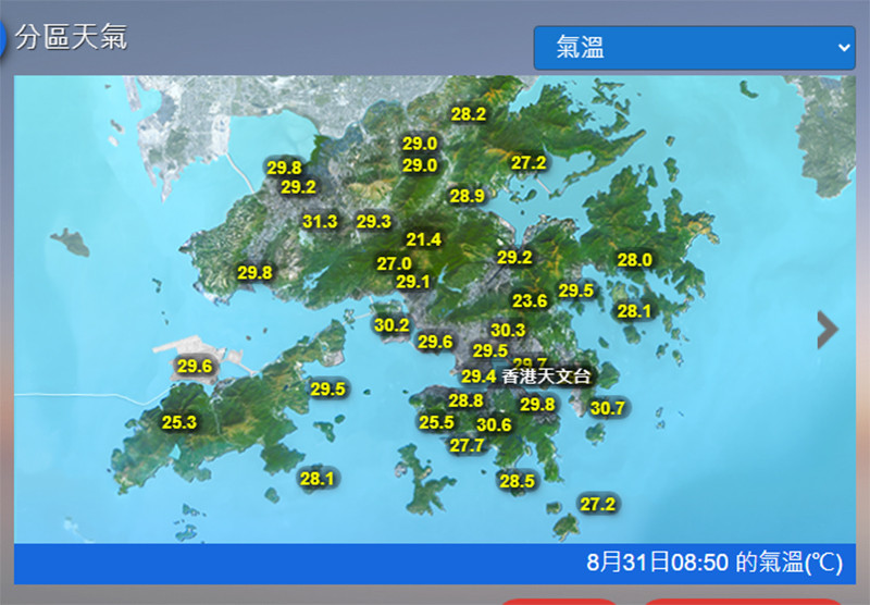 即時熱點 天氣|天文台:炎熱料有一兩陣驟雨 稍後局部地區有雷暴 (09:01) 發佈於 1 個月 前 2025 年 8 月 31 日 By 明報 早上8時50分,天文台錄得氣溫29.4°C,相對濕度75%。一股偏東氣流正影響廣東沿岸。同時,高空擾動正為該區帶來驟雨。本港地區今日(8月31日)天氣預測:短暫時間有陽光,有一兩陣驟雨。日間炎熱,市區最高氣溫約32°C,新界再高一兩度,稍後局部地區有雷暴。吹和緩偏東風。展望明日(9月1日)有幾陣驟雨,日間短暫時間有陽光。本周中期日間酷熱。(天文台) 相關文章:天文台天氣天氣速遞編輯推介 Up Next 專訪預告:搖搖大賽世界冠軍教你兩招搖搖基本功【短片】 (18:18) 不要錯過 天氣|天文台:周日多雲有驟雨 最高32°C (18:37) 繼續閱讀 贊助商 猜你喜歡 周末近天文大潮 強颱料入400公里 天文台考慮周五晚發出一號戒備信號 (12:07) 麥德姆|麥德姆周六進入本港800公里範圍 央視:料為華南地區帶來明顯風雨 (11:27) 天氣|酷熱警告生效 天文台:周四周五天晴酷熱 周六驟雨漸增 (08:14) 麥德姆|央視:料麥德姆為華南地區帶來明顯風雨 (13:40) 麥德姆 | 珠西海域漁船明晚全部回港避風 (21:56)