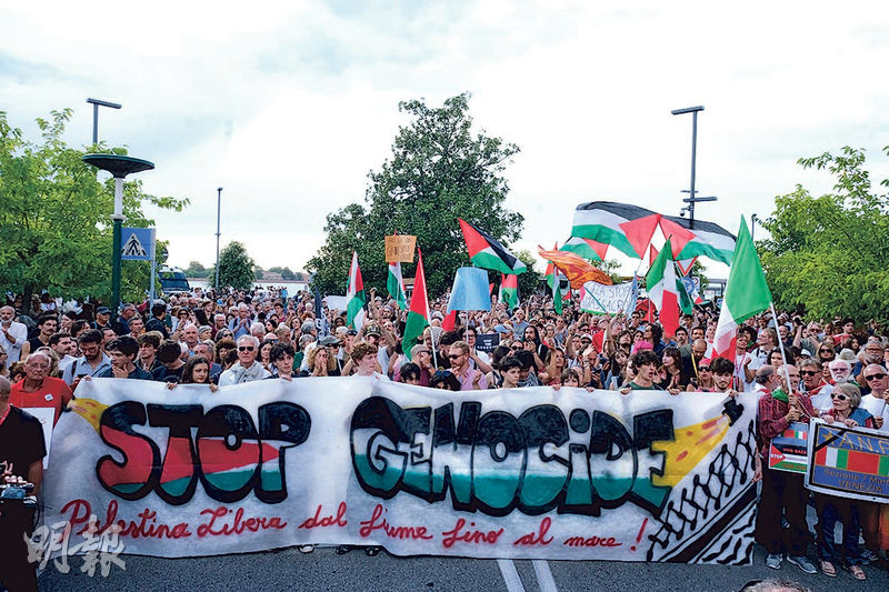 【明報專訊】數以千計示威者上周六(8月30日)傍晚遊行至意大利威尼斯影展場外,關注以色列圍攻加沙,現場高舉有巴勒斯坦旗幟,亦有標語及橫額寫着有「停止種族滅絕」(圖)、「你們所有人都是種族滅絕目擊者」等句。同日,法國里昂的猶太人大屠殺紀念碑被塗鴉「Free Gaza」(解放加沙)字樣,里昂市長杜塞指事件「無法容忍」,將緝捕並檢控肇事者。