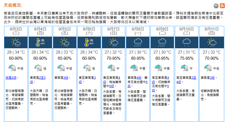 即時熱點 天氣|天文台:周三有驟雨雷暴 酷熱市區最高34°C (20:51) 發佈於 2 個月 前 2025 年 9 月 2 日 By 明報 天文台表示,周三(3日)本港大致多雲,有幾陣驟雨,初時局部地區有雷暴,最低氣溫約28°C。日間部分時間有陽光及酷熱,市區最高氣溫約34°C,新界再高一兩度。吹微風。展望隨後兩三日大致天晴,持續酷熱,局部地區有驟雨。下周初驟雨逐漸增多。 > 相關文章:天文台天氣天氣速遞 Up Next 5分鐘短片回顧九三閱兵全過程 附抗戰勝利80周年紀念大會重點 (12:05) 不要錯過 專訪預告:搖搖大賽世界冠軍教你兩招搖搖基本功【短片】 (18:18) 繼續閱讀 贊助商 猜你喜歡 天文台上午8時40分錄18.4°C 今年入秋以來最低 (09:03) 天文台取消所有熱帶氣旋警告信號 (18:20) 天氣|天文台:周三有幾陣雨 市區最低19°C (20:57) 風神 | 緩慢趨向西南 海口3港停運 (00:34) 風神|教育局:幼稚園及部分特殊學校明日停課 (17:33) 天文台:下午5時20分直接發出三號強風信號 (12:06)