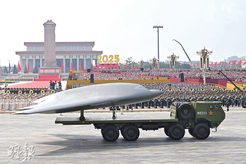 【明報專訊】抗戰勝利80周年大閱兵展示了大批無人作戰裝備,包括有「忠誠僚機」之稱的攻擊11大型隱形無人機。同時,反無人機「鐵三角」——激光、微波、彈炮也在閱兵場上亮相。官媒稱這些解放軍現役武器,表明中國的新型反無技術走在世界前沿。專家指出,此次閱兵顯示了中國正擁抱無人機作戰時代。