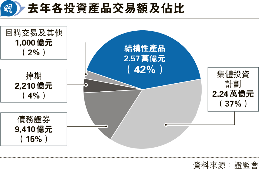 【明報專訊】證監會及金管局發表有關非交易所買賣投資產品分銷情况的年度聯合調查結果,去年持牌法團和註冊機構的非交易所買賣投資產品,總交易額按年飈四成至6.07萬億元的紀錄新高。去年結構性產品為受訪公司銷售最多的產品種類,金額近2.57萬億元、佔總交易額的42%(見圖),另集體投資計劃交易額達2.24萬億元、佔總交易額的37%。