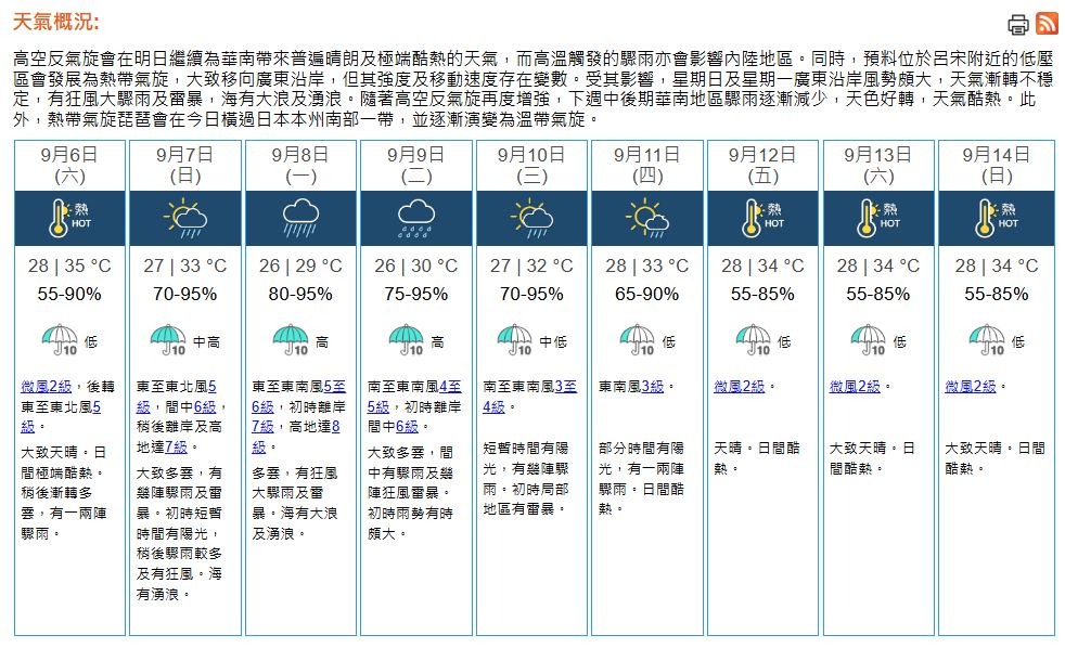 預料受其影響,下周日(7日)稍後本港風勢逐漸增強,天氣漸轉不穩定。下周一(8日)風勢頗大,有狂風大驟雨及雷暴,海有大浪及湧浪。受風暴潮影響,周一早上沿岸低窪地區有機會出現水浸。天文台會視乎該熱帶氣旋的強度、其強風區與本港的距離及本地風力變化,評估是否需要在周日改發更高熱帶氣旋警告信號。市民請留意天文台的最新天氣消息。(天文台)
