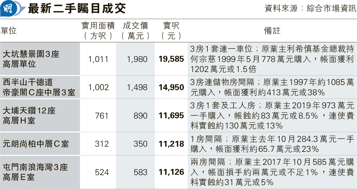 此外,由曾任高盛(亞洲)執行董事及花旗私人銀行董事總經理及主管、現為利希慎基金總裁何宗慈持有的大坑慧景園3座高層單位,實用1011方呎,3房1套連一車位,以1980萬元易手,實呎19,585元;何氏1999年5月778萬元購入,持貨約26年,帳面獲利1202萬元或1.5倍。美聯物業高級分區營業經理陳凱廸表示,西半山干德道帝豪閣C座中層3室,實用1002方呎,3房1套連儲物房間隔,獲同區換樓客以1498萬元承接,實呎約14,950元;原業主1997年約1085萬元購入,持貨約28年,帳面獲利約413萬元或約38%。