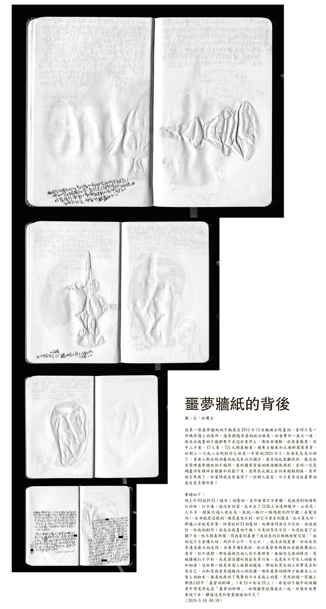 【明報專訊】我第一張噩夢牆紙的手稿是在2015-6-15在觀塘法院畫的,當時只是一件偶然遇上的案件。後來跟隨香港的政治發展,社會事件一波又一波,我在法庭畫的手稿都集中在這些案件上,像雨傘運動、旺角暴動案、佔中三子案、47人案、721元朗暴動案、蘋果日報案和立場新聞案等等,但對上一次我入法院創作已經是一年前的2024-9-3。社會氣氛是冷卻了,香港人對法院的審訊也沒有以往關注,連資訊也很難找到。最近我在整理噩夢牆紙的手稿時,看到圖案背後的痕迹頗為深刻,當時一定是竭盡所有精神去聽審和刻劃下來,我用指尖摸上去仍有點點刺痛。案件就不用提了,但當時我在背後寫了一些個人感受,今日看來這些真實的感受是多麼珍貴!